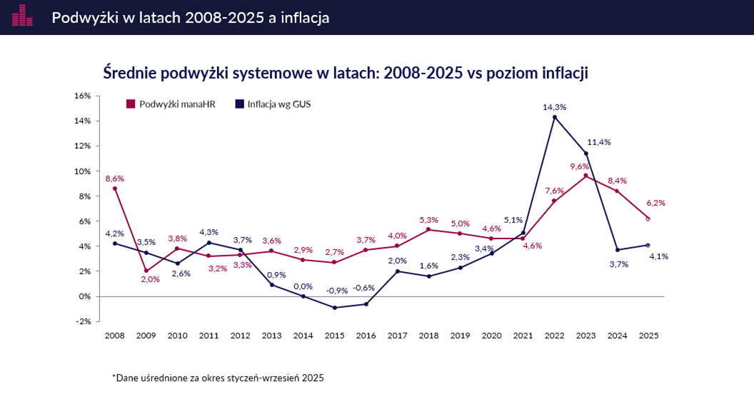 Wykres. Analiza podwyżek manaHR 2008-2025; poziom inflacji – dane z GUS